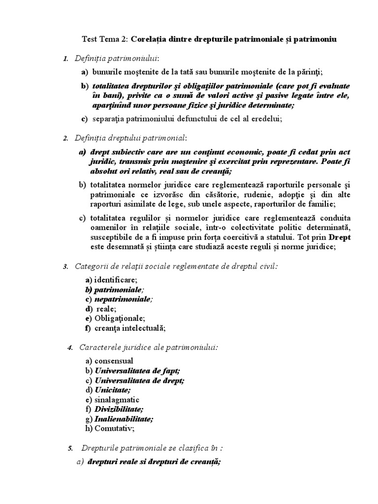Test Tema 2: Corelația dintre drepturile patrimoniale și patrimoniu