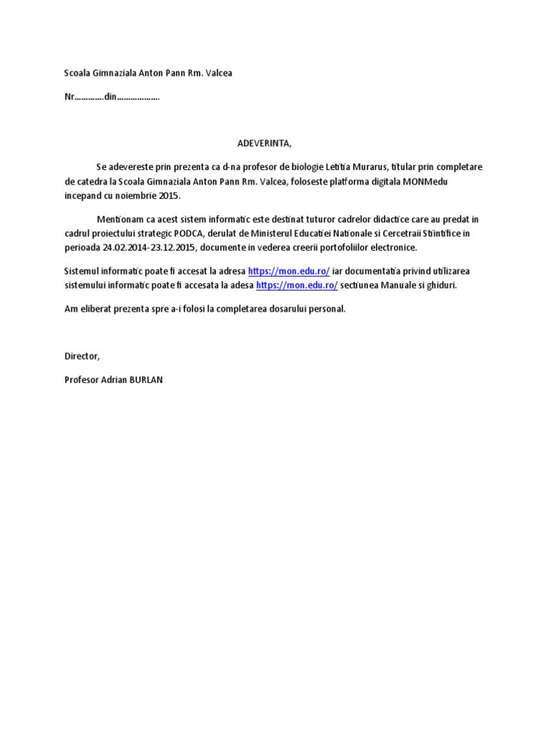 Se adevereste prin prezenta ca d-na profesor de biologie Letitia Murarus, titular prin completare