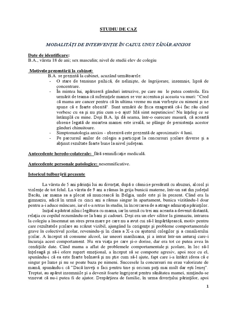 B.A., vârsta 18 de ani; sex masculin; nivel de studii elev de colegiu