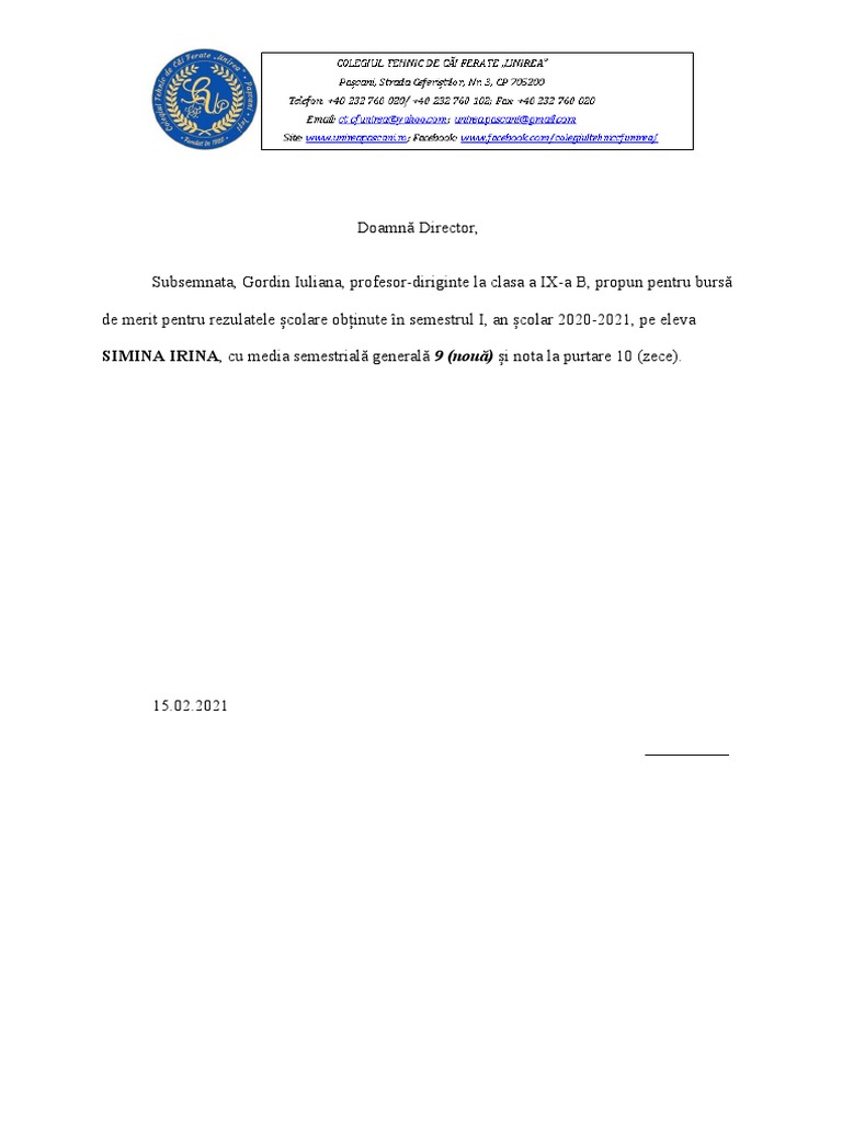 Subsemnata, Gordin Iuliana, profesor-diriginte la clasa a IX-a B, propun pentru bursă