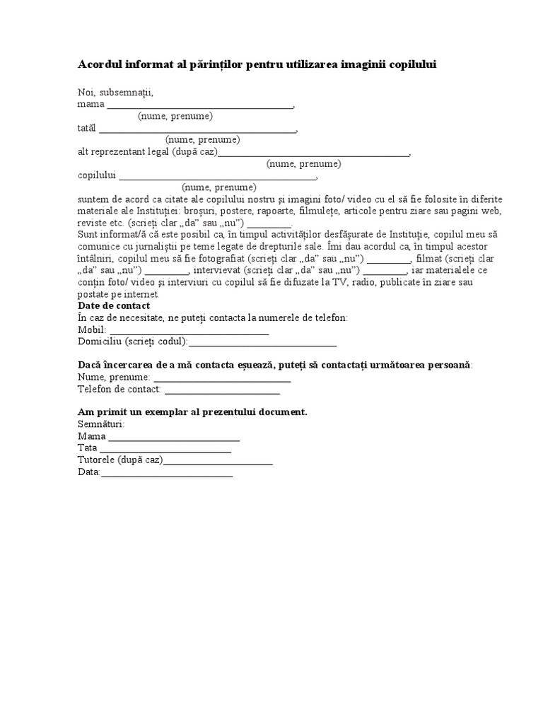 Acordul informat al părinților pentru utilizarea imaginii copilului