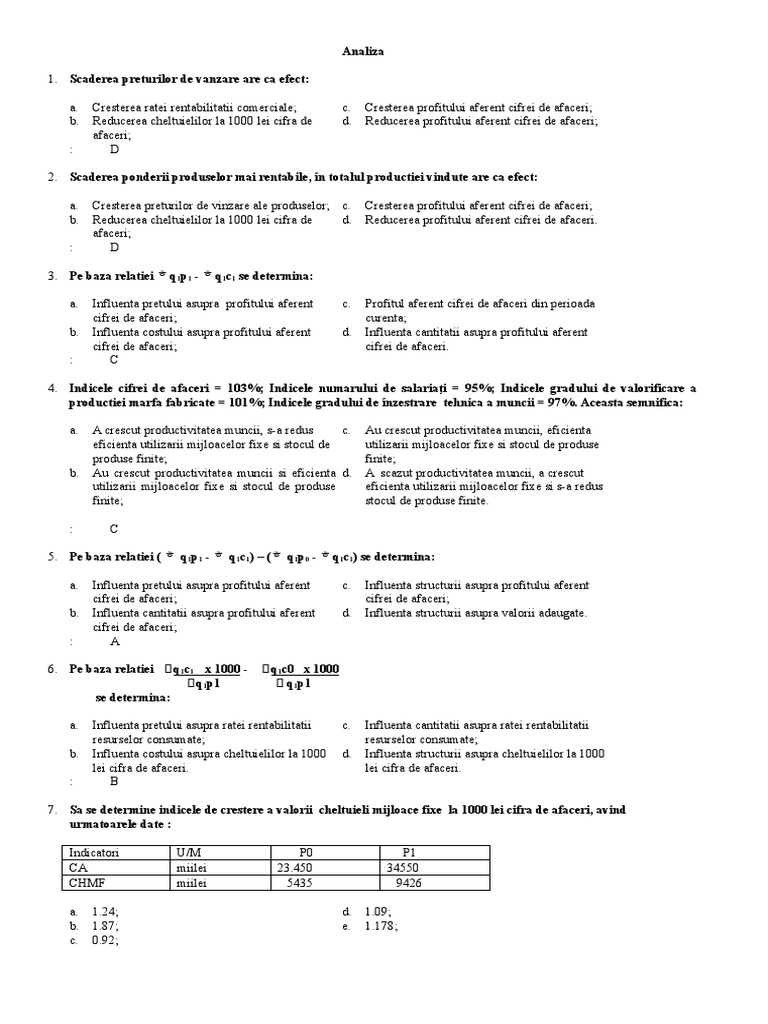 a. Influenta pretului asupra profitului aferent c. Influenta structurii asupra profitului aferent