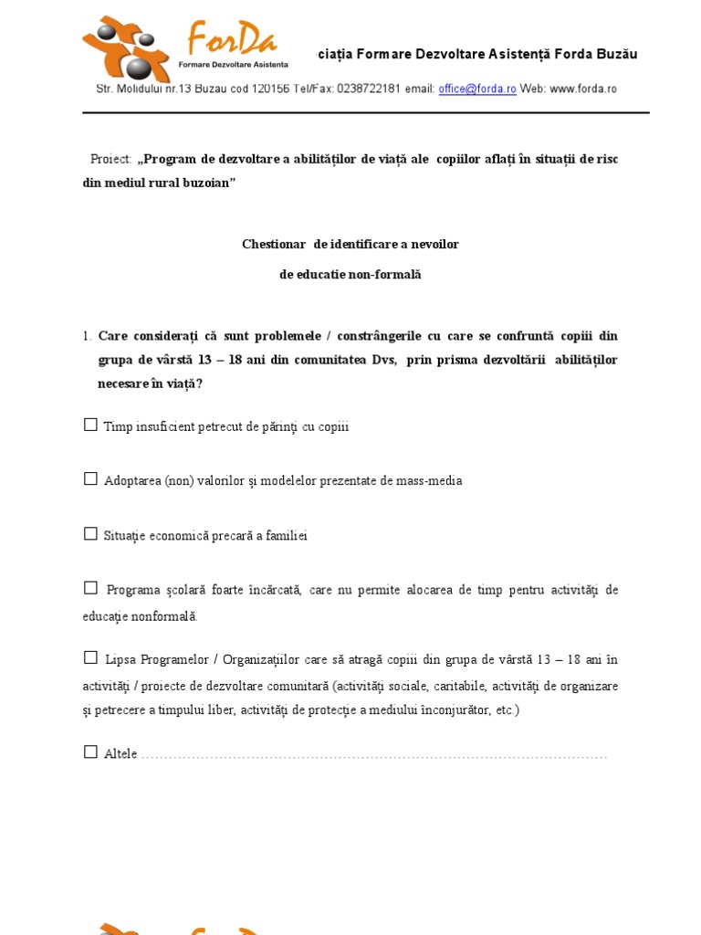 Proiect: „Program de dezvoltare a abilităţilor de viaţă ale copiilor aflaţi în situaţii de risc