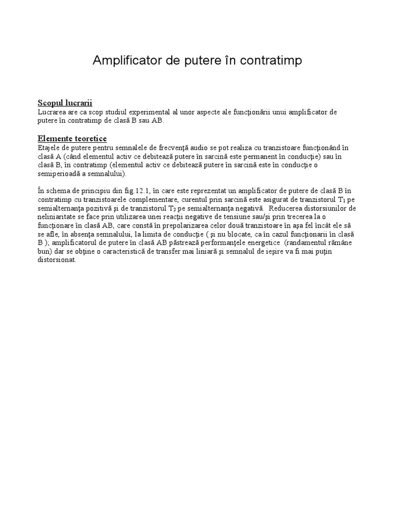 În schema de principiu din fig.12.1, în care este reprezentat un amplificator de putere de clasă B în