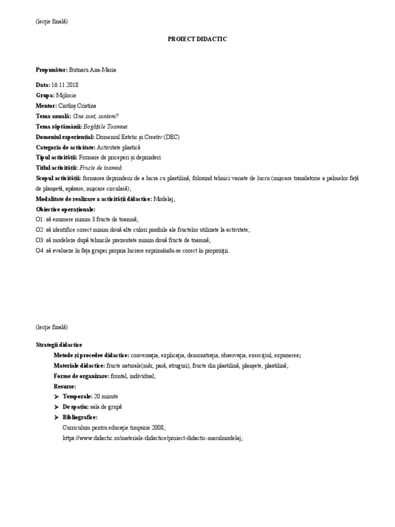 Materiale didactice: fructe naturale(măr, pară, struguri), fructe din plastilină, planșete, plastilină;