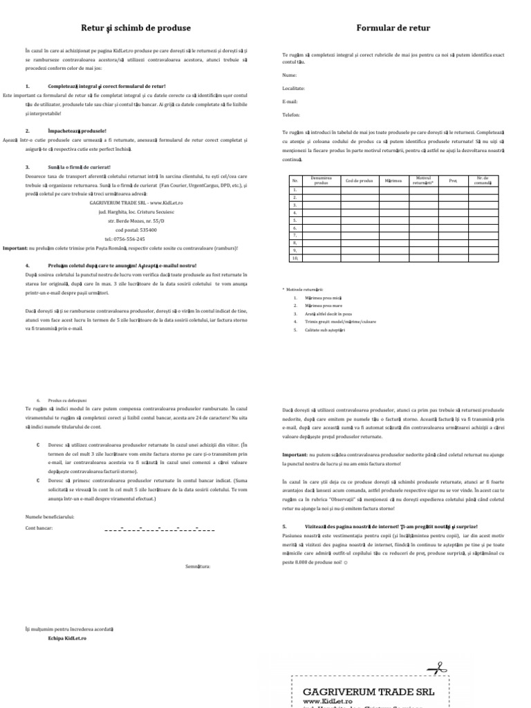 Așează într-o cutie produsele care urmează a fi returnate, anexează formularul de retur corect completat și cu atenție și coloana codului de produs ca să putem identifica produsele returnate! Să nu uiți să