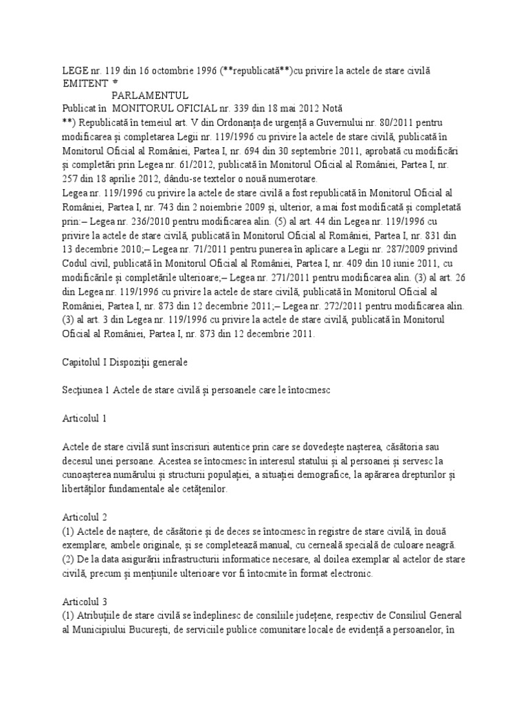 119/1996 cu privire la actele de stare civilă și prevederile art. II și IV din Ordonanța d
