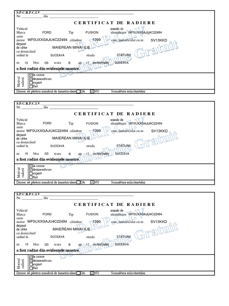 Doresc să păstrez numărul de înmatriculare □ DA □ NU Semnătura solicitantului: