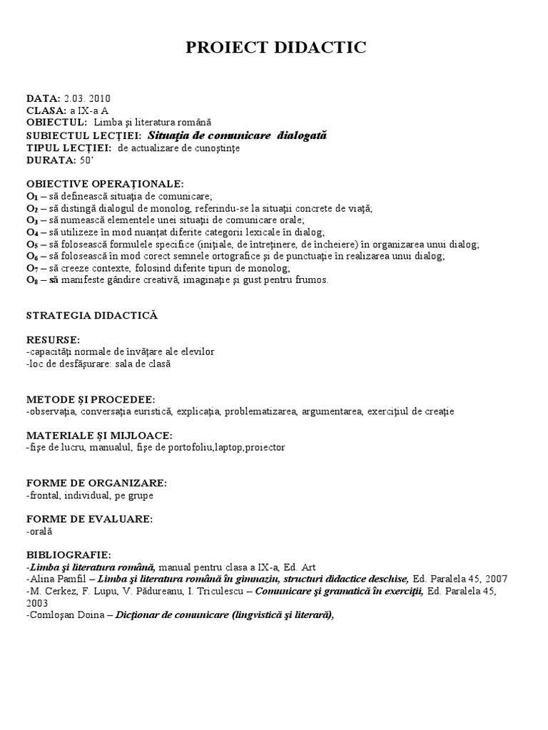 SUBIECTUL LECŢIEI: Situaţia de comunicare dialogată