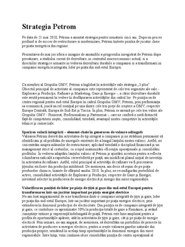 Pe data de 21 mai 2010, Petrom a anuntat strategia pentru urmatorii cinci ani. Dupa un proces