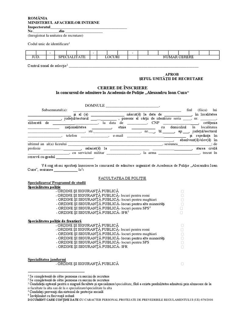 Vă rog să-mi aprobaţi înscrierea la concursul de admitere organizat de Academia de Poliţie „Alexandru Ioan