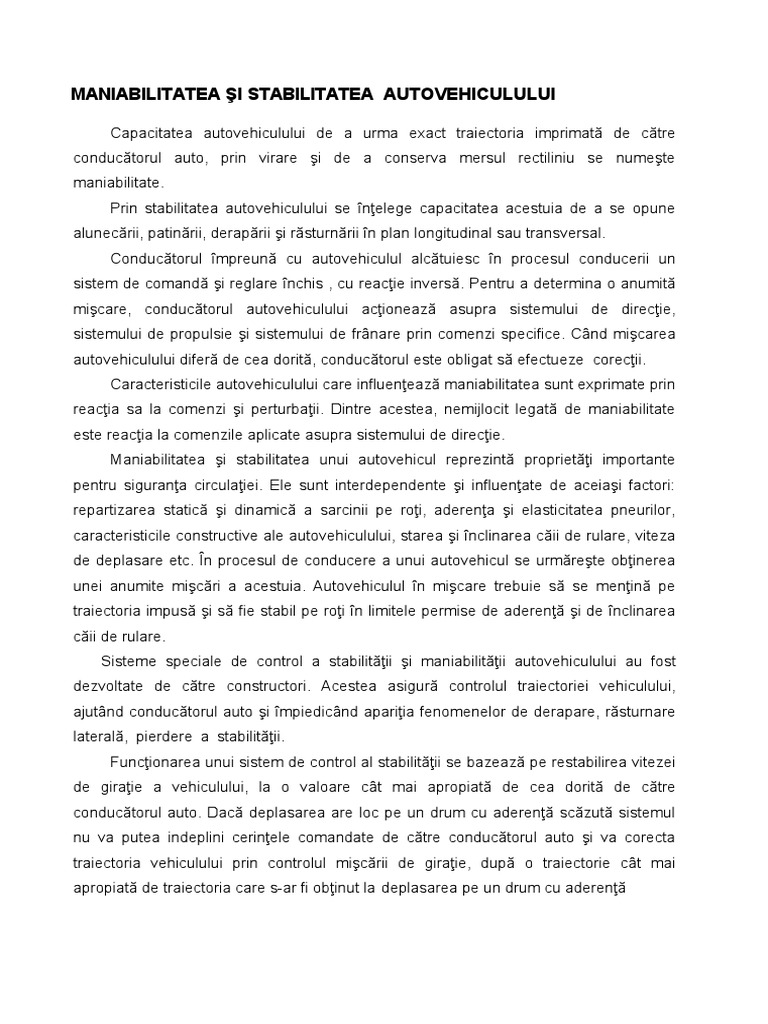 Maniabilitatea şi stabilitatea unui autovehicul reprezintă proprietăţi importante
