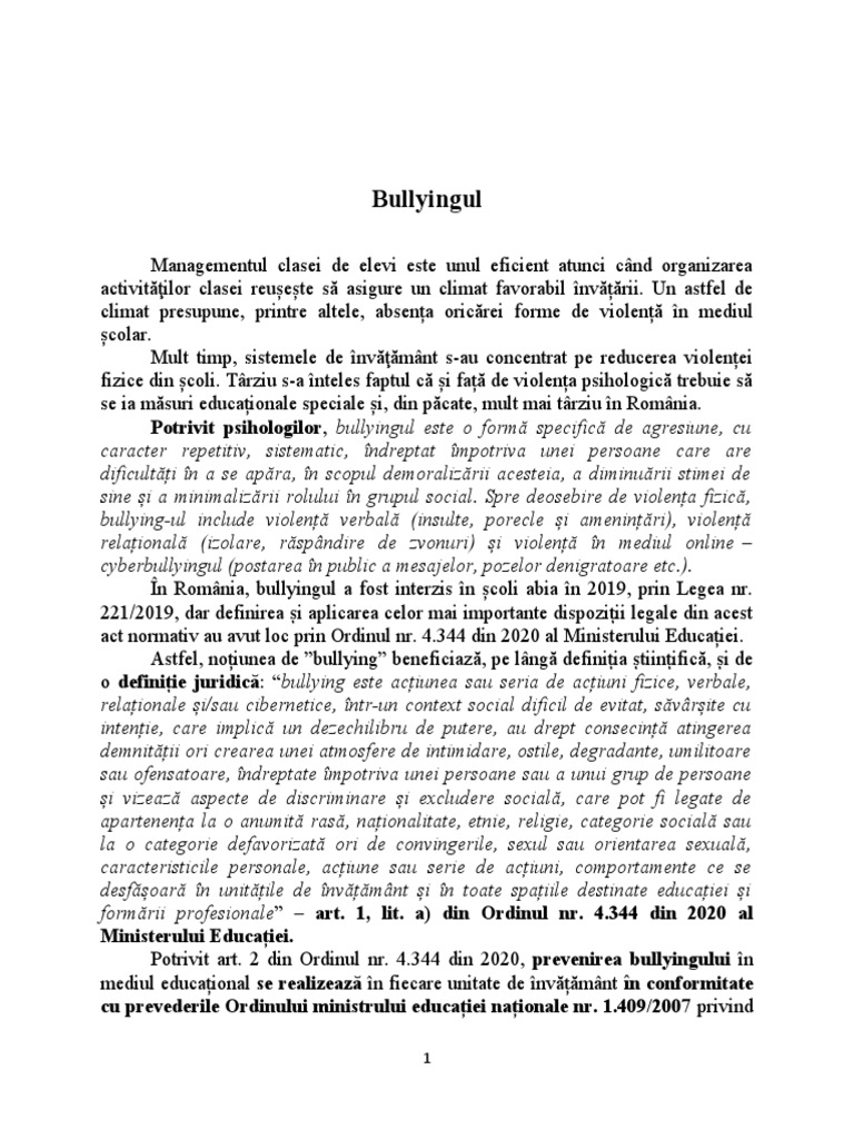 Potrivit art. 2 din Ordinul nr. 4.344 din 2020, prevenirea bullyingului în