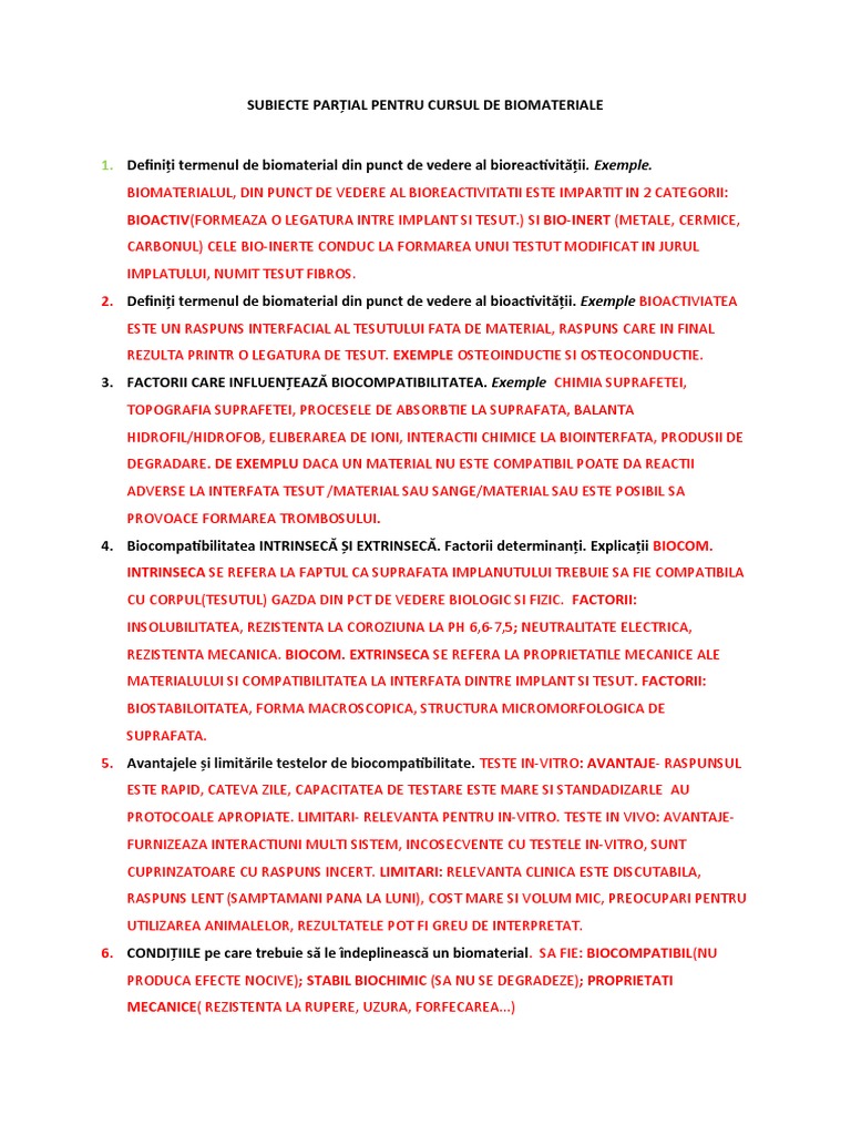 SUBIECTE PARȚIAL PENTRU CURSUL DE BIOMATERIALE