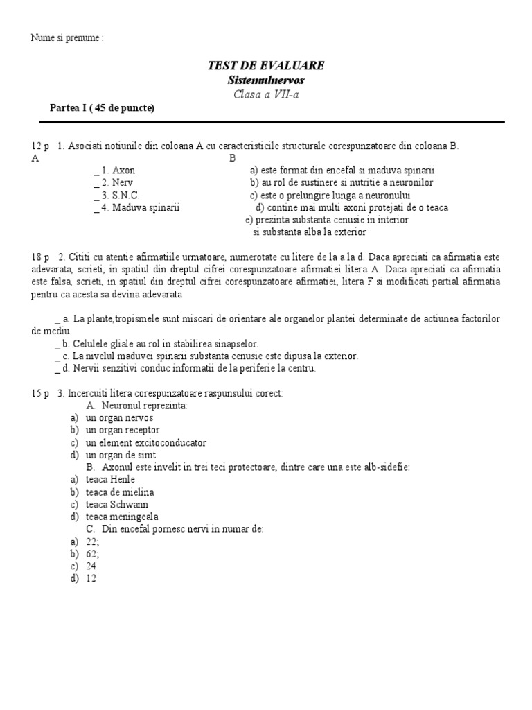 1. a) Enumerareacelordouatipuri de substanta a SNC2×2p=5puncte