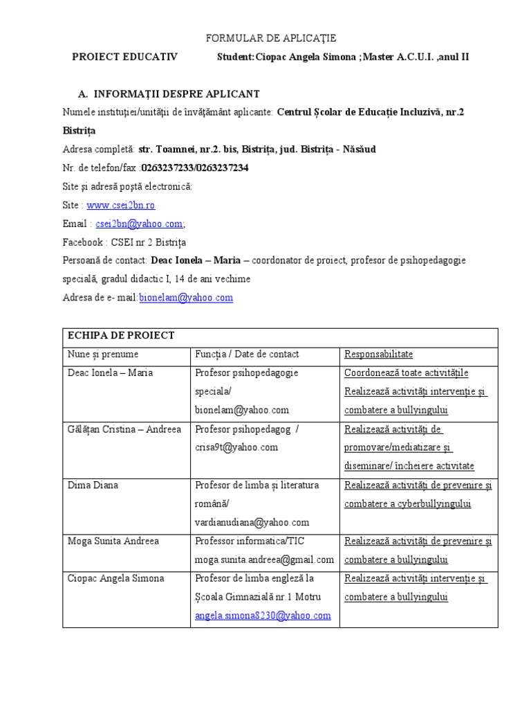 Persoană de contact: Deac Ionela – Maria – coordonator de proiect, profesor de psihopedagogie