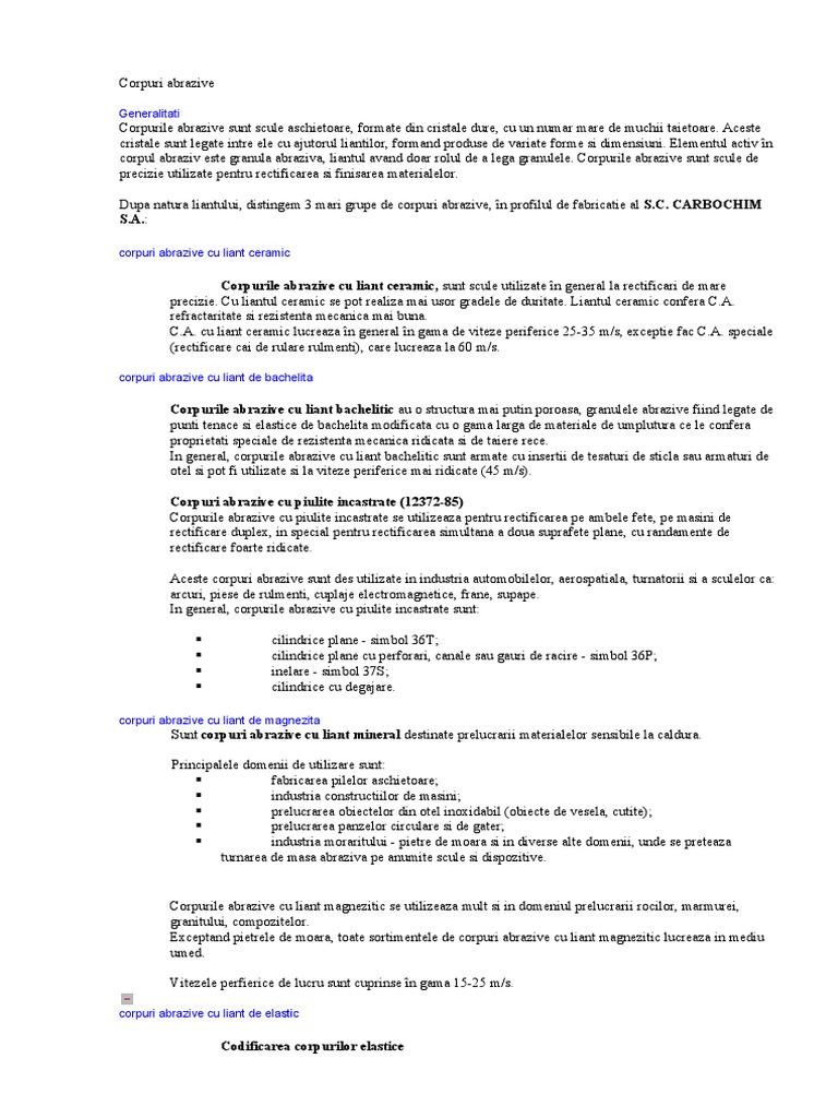 Dupa natura liantului, distingem 3 mari grupe de corpuri abrazive, în profilul de fabricatie al S.C. CARBOCHIM