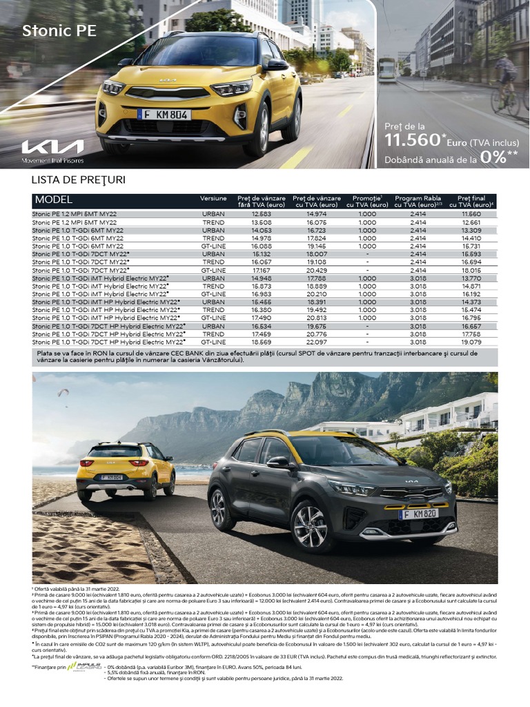 Preţul final este obţinut prin scăderea din preţul cu TVA a promoției Kia, a primei de casare (pentru casarea a 2 autovehicule uzate) şi a Ecobonusurilor (acolo unde este cazul). Oferta este valabilă în limita fondurilor