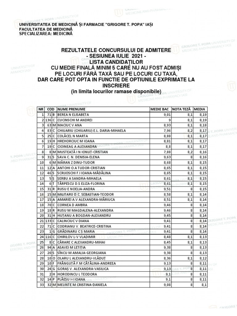 CU MEDIE FINALĂ MINIM 5 CARE NU AU FOST ADMIȘI