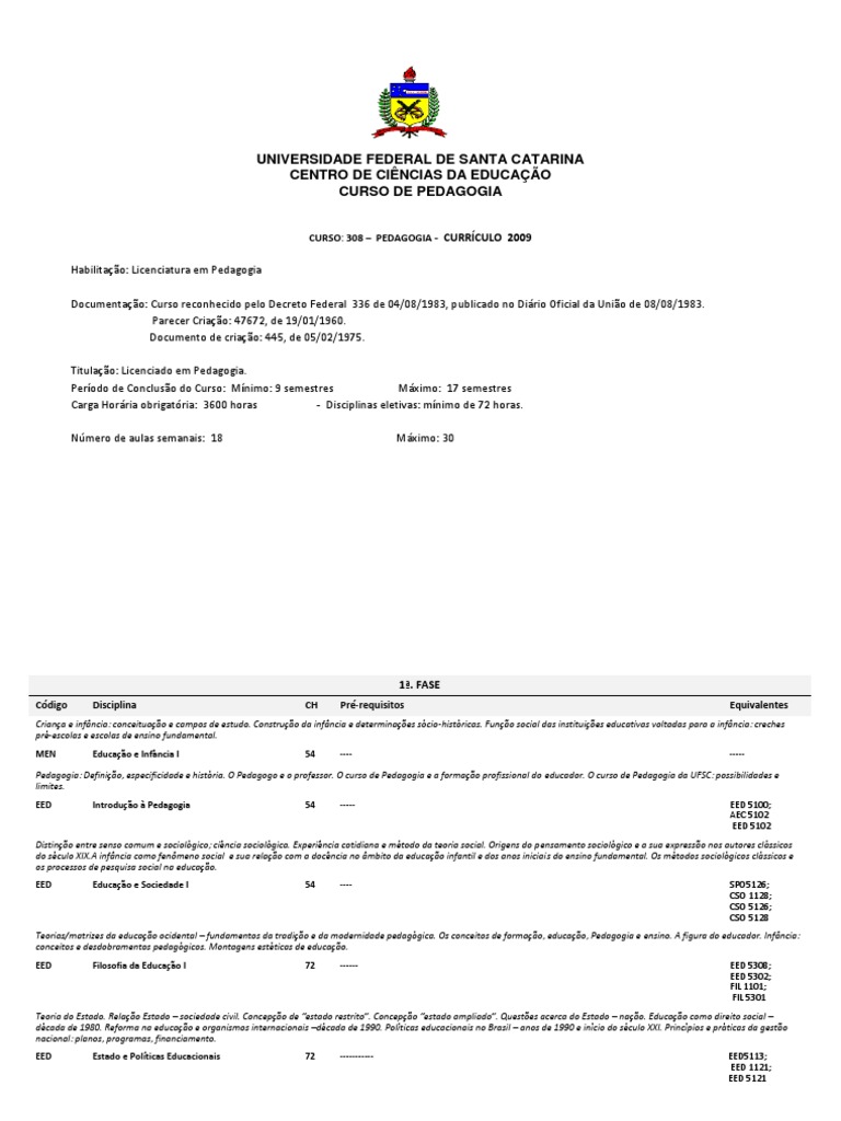 CURSO: 308 – PEDAGOGIA - CURRÍCULO 2009
