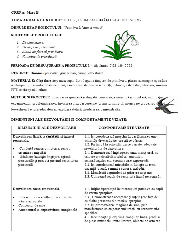 subtema săptămânii ( Ziua Mamei, păsări, flori și legume de primăvară etc.).