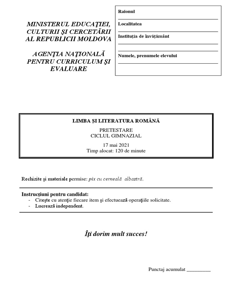 Rechizite şi materiale permise: pix cu cerneală albastră.