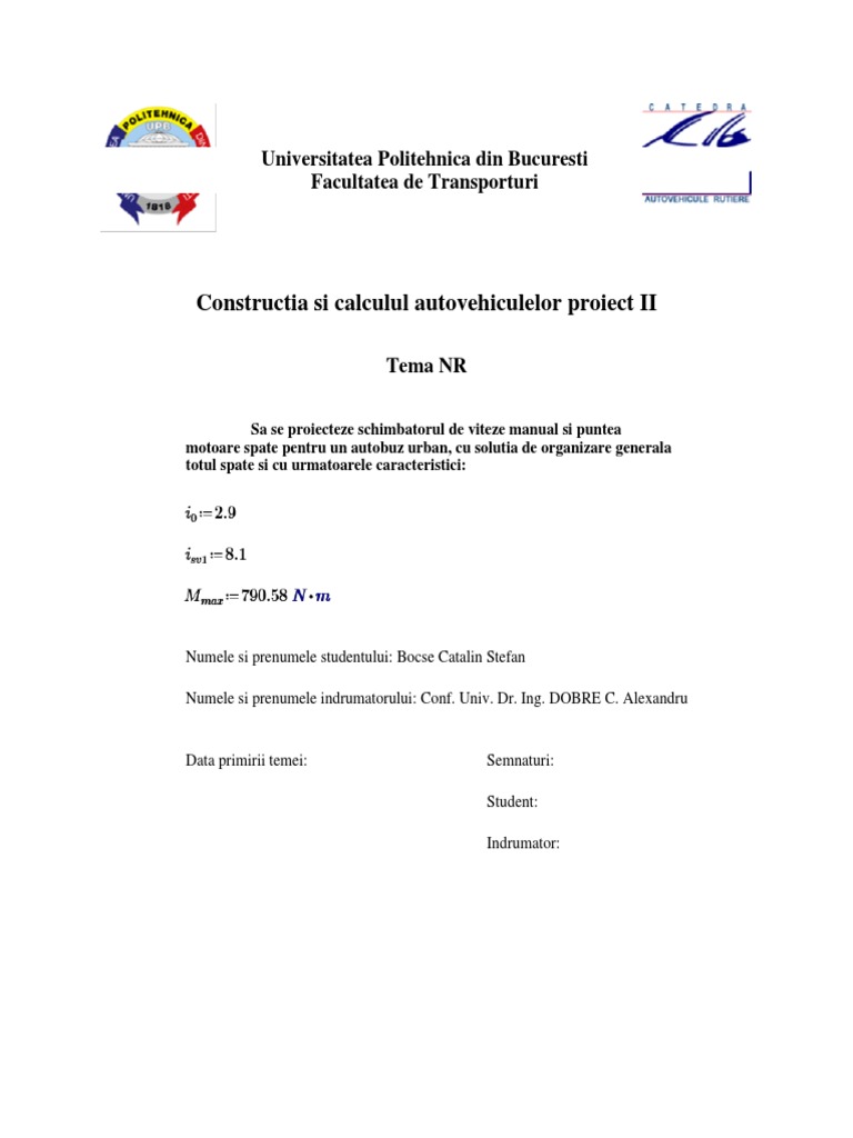 Constructia si calculul autovehiculelor proiect II