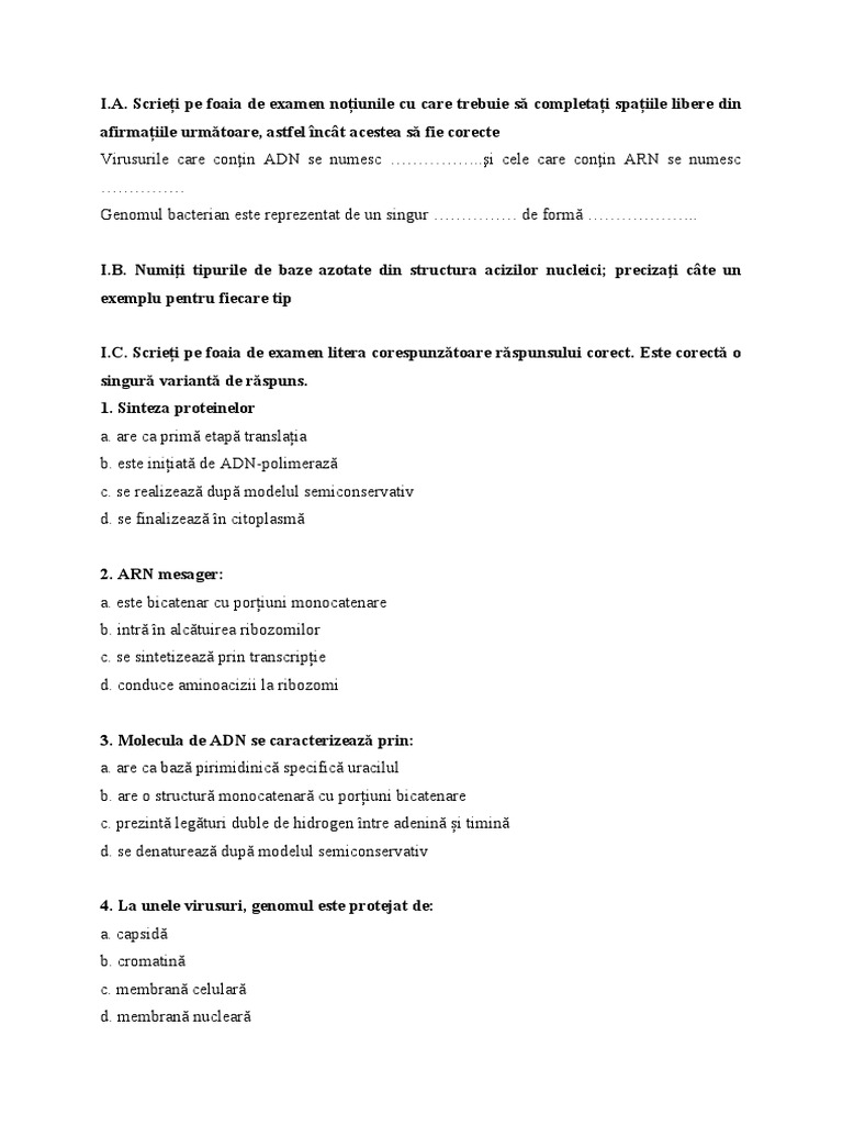 I.B. Numiţi tipurile de baze azotate din structura acizilor nucleici; precizaţi câte un
