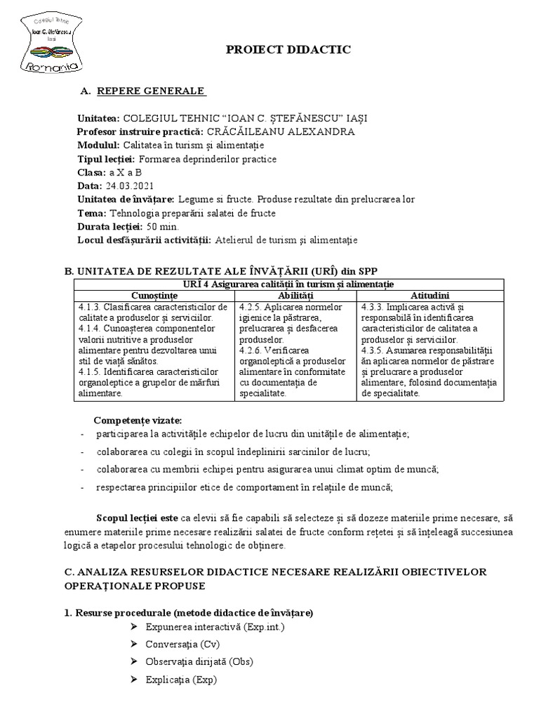 Unitatea de învăţare: Legume si fructe. Produse rezultate din prelucrarea lor