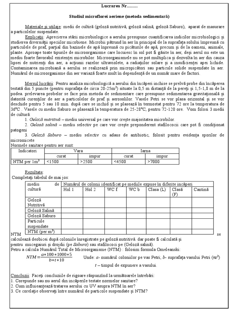 Mersul lucrării: Pentru analiza micobiologică a aerului din încăperi inchise se prelvă probe din încăperea