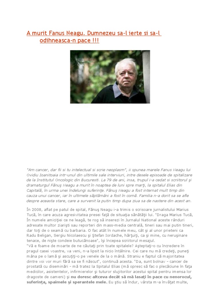 "Am cancer, dar fii si tu intelectual si scrie neoplasm", ii spunea marele Fanus Neagu lui