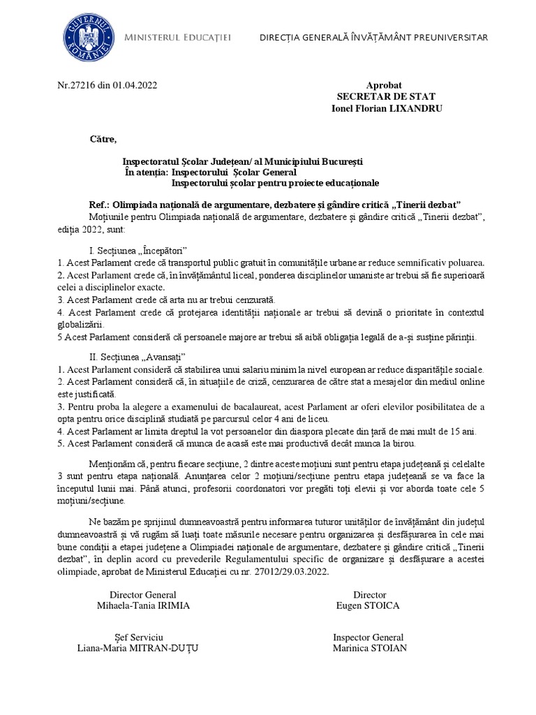 Ref.: Olimpiada națională de argumentare, dezbatere și gândire critică „Tinerii dezbat”