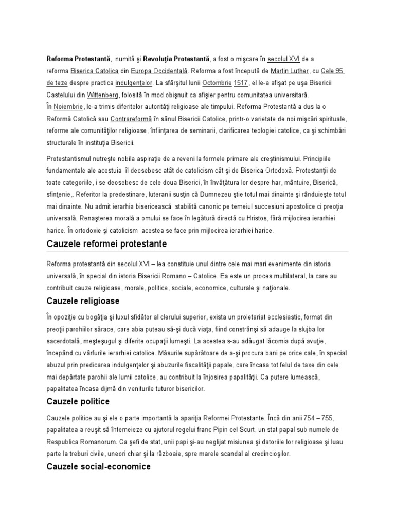 reforma Biserica Catolica din Europa Occidentală. Reforma a fost începută de Martin Luther, cu Cele 95