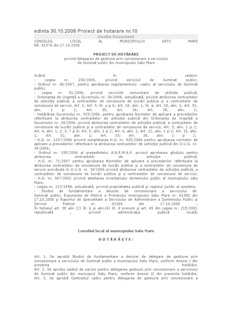 concesionare a serviciului de iluminat public a municipiului Satu Mare, conform Anexei I din