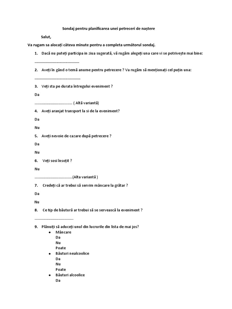 Sondaj pentru planificarea unei petreceri de naștere