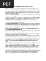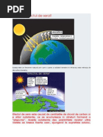 Prin poluare apare o impurificare a aerului datorita particulelor solide gazelor, vaporilor de apa, particulelor radioactive si microorganismelor de tipul bacteriilor, [Link] aerul poluat din zonele industriale se gasesc impuritati sub forma particulelor solide(aerosoli), picaturi(aerosoli lichizi), gaze si vapori. In functie de starea lor de agregare, poluantii din aer pot fi: poluanti gazosi si solizi. Poluantii gazosi Acestia reprezinta 90% din masa totala a poluantilor emisi in atmosfera, fiind sub forma de gaze,aerosoli lichizi(vapori). -Dioxidul de carbon(CO2)-este un gaz periculos care prin dublarea concentratiei sale din aer, devine un element perturbator [Link] sa a inregistrat o crestere inca de la sfarsitul secolului trecut, datorita consumului de combustibili fosili folositi in industrie in scopul producerii de energie, cat si a despaduririlor masive. Concentratia maxima normala de CO2 admisa in atmosfera este de 0,3mg/mc de aer, iar cresterea concentratiei peste 2-3% il face toxic pentru om, cu efecte mortale la cresteri de 10-20%.Prin arderea padurilor si a oxidarii humusului forestier din zonele despadurite, se elibereaza anual in atmosfera 8x109t CO2. Oxidul de carbon(CO)-este cel mai raspandit poluant atmosferic cu o concentratie medie de 0,1-0,[Link] naturale de CO sunt eruptii vulcanice, fermentatiile anaerobe din mlastini, descarcarile electrice, incendiile forestiere, iar ca surse artificiale amintim arderile de combustibil ca: benzina, carbune, lemn, [Link] sa, se mentine constanta datorita bacteriilor din sol care absorb CO si il transforma in CO2 sau metan(CH4). -Hidrocarburile-sunt eliminate prin arderea incompleta a carburantillor, concentratia lor in atmosfera devenind peericuloasa pentru om, cu efecte cancerigene, exemplu:clorantrenul si benzopirenul. Ca sursa naturala de hidrocarburi amintim vegetatia Terrei care produce 109t/an hidrocarburi terpenice. -Aldehidele-exemplu:acroleina, foarte toxica si iritanta pt. om, substanta eliminata in natura de rafinariile de petrol, motoarele autovehiculelor, de crematoarele de gunoaie menajere. -Bioxidul de sulf (SO2)-provine din eruptiile vulcanice, din arderile combustibililor si din actiunile industriei metalurgice. Acest gaz are efecte toxice asupra plantelor producand leziuni foliare si nevroze opicale mai ales la conifere sau specii lemnoase ca:plopul ,castanul, teiul, mesteacanul, cedrul, catalpa etc. .
