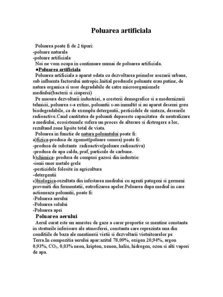 Poluarea poate fi de 2 tipuri: -poluare naturala -poluare artificiala Noi ne vom ocupa in continuare numai de poluarea artificiala. Poluarea artificiala Poluarea artificiala a aparut odata cu dezvoltarea primelor asezarii urbane, sub influenta factorului [Link] produsele poluante erau putine, de natura organica si usor degradabile de catre microorganismele mediului(bacterii si ciuperci) Pe masura dezvoltarii industriei, a cresterii demografice si a modernizarii tehnicii, poluarea s-a extins, poluantii s-au inmultit si au aparut deseuri greu biodegradabile, ca de exemplu detergentii, pesticidele de sinteza, deseurile [Link] cantitatea de poluanti depaseste capacitatea de neutralizare a mediului, ecosistemele sufera un proces de alterare si distrugere a lor, rezultand zone lipsite total de viata. Poluarea in functie de natura poluantului poate fi: a)fizica-produsa de zgomot(poluare sonora) poate fi: -produsa de substante radioactive(poluare radioactiva) -produsa de apa calda, praf, particule de carbune. b)chimica- produsa de compusi gazosi din industrie: -ionii unor metale grele -pesticidele folosite in agricultura -detergentii c)biologica-rezultata din infestarea mediului cu agenti patogeni si germeni proveniti din fermentatii, eutrofizarea [Link] dupa mediul in care actioneaza poluantii, poate fi: -Poluarea aerului -Poluarea solului -Poluarea apei