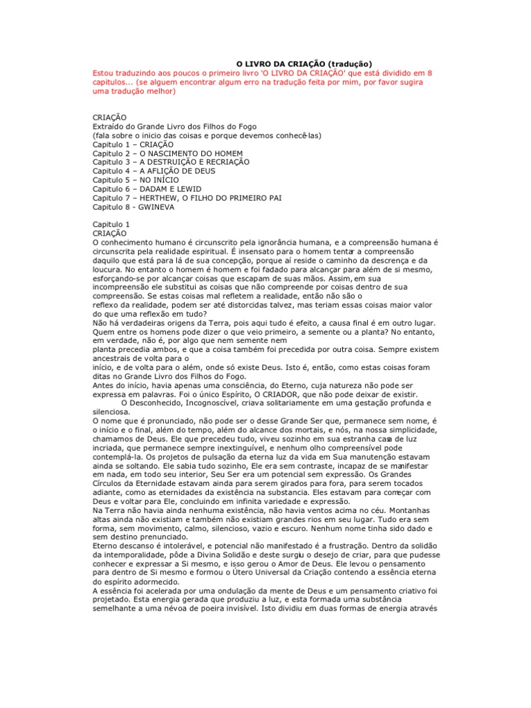 em 8 capitulos... (se alguem encontrar algum erro na traduo feita por mim, por favor sugira uma traduo melhor) CRIAO Extrado do Grande Livro dos Filhos do Fogo (fala sobre o inicio das coisas e porque devemos conhec -las) Capitulo 1 CRIAO Capitulo 2 O NASCIMENTO DO HOMEM Capitulo 3 A DESTRUIO E RECRIAO Capitulo 4 A AFLIO DE DEUS Capitulo 5 NO INCIO Capitulo 6 DADAM E LEWID Capitulo 7 HERTHEW, O FILHO DO PRIMEIRO PAI Capitulo 8 - GWINEVA Capitulo 1 CRIAO O conhecimento humano circunscrito pela ignorncia humana, e a compreenso humana circunscrita pela realidade espiritual. insensato para o homem tenta a compreenso r daquilo que est para l de sua concepo, porque a reside o caminho da descrena e da loucura. No entanto o homem homem e foi fadado para alcanar para alm de si mesmo, esforando-se por alcanar coisas que escapam de suas mos. Assim, em sua incompreenso ele substitui as coisas que no compreende por coisas dentro de sua compreenso. Se estas coisas mal refletem a realidade, ento no so o reflexo da realidade, podem ser at distorcidas talvez, mas teriam essas coisas maior valor do que uma reflexo em tudo? No h verdadeiras origens da Terra, pois aqui tudo efeito, a causa final em outro lugar. Quem entre os homens pode dizer o que veio primeiro, a semente ou a planta? No entanto, em verdade, no , por algo que nem semente nem planta precedia ambos, e que a coisa tambm foi precedida por outra coisa. Sempre existem ancestrais de volta para o incio, e de volta para o alm, onde s existe Deus. Isto , ento, como estas coisas foram ditas no Grande Livro dos Filhos do Fogo. Antes do incio, havia apenas uma conscincia, do Eterno, cuja natureza no pode ser expressa em palavras. Foi o nico Esprito, O CRIADOR, que no pode deixar de existir. O Desconhecido, Incognoscvel, criava solitariamente em uma gestao profunda e silenciosa. O nome que pronunciado, no pode ser o desse Grande Ser que, permanece sem nome, o incio e o final, alm do tempo, alm do alcance dos mortais, e ns, na nossa simplicidade, chamamos de Deus. Ele que precedeu tudo, viveu sozinho em sua estranha cas de luz a incriada, que permanece sempre inextinguvel, e nenhum olho compreensvel pode contempl-la. Os projetos de pulsao da eterna luz da vida em Sua manuteno estavam ainda se soltando. Ele sabia tudo sozinho, Ele era sem contraste, incapaz de se ma nifestar em nada, em todo seu interior, Seu Ser era um potencial sem expresso. Os Grandes Crculos da Eternidade estavam ainda para serem girados para fora, para serem tocados adiante, como as eternidades da existncia na substancia. Eles estavam para com ear com Deus e voltar para Ele, concluindo em infinita variedade e expresso. Na Terra no havia ainda nenhuma existncia, no havia ventos acima no cu. Montanhas altas ainda no existiam e tambm no existiam grandes rios em seu lugar. Tudo era sem forma, sem movimento, calmo, silencioso, vazio e escuro. Nenhum nome tinha sido dado e sem destino prenunciado. Eterno descanso intolervel, e potencial no manifestado a frustrao. Dentro da solido da intemporalidade, pde a Divina Solido e deste surgiu o desejo de criar, para que pudesse conhecer e expressar a Si mesmo, e isso gerou o Amor de Deus. Ele levou o pensamento para dentro de Si mesmo e formou o tero Universal da Criao contendo a essncia eterna do esprito adormecido. A essncia foi acelerada por uma ondulao da mente de Deus e um pensamento criativo foi projetado. Esta energia gerada que produziu a luz, e esta formada uma substncia semelhante a uma nvoa de poeira invisvel. Isto dividiu em duas formas de energia atravs