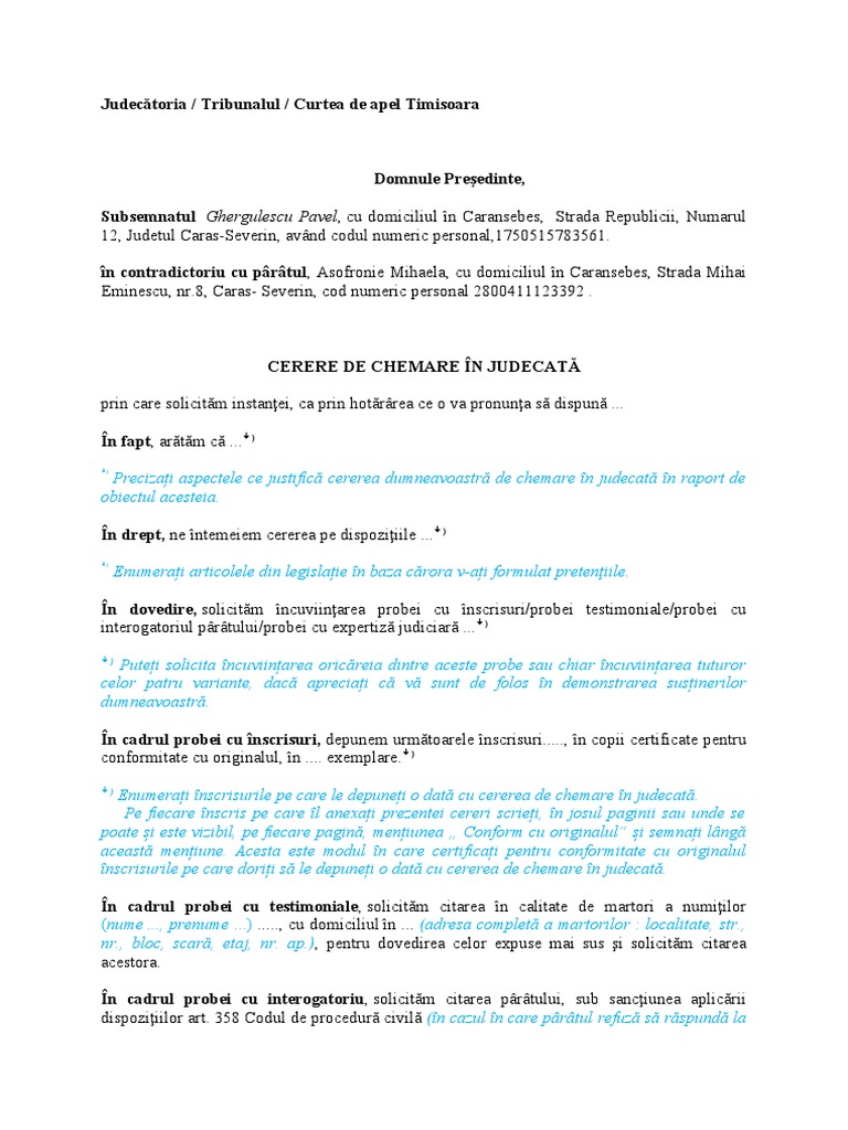 Depunem prezenta cerere de chemare în judecată, în ... exemplare.ꜜ⁾