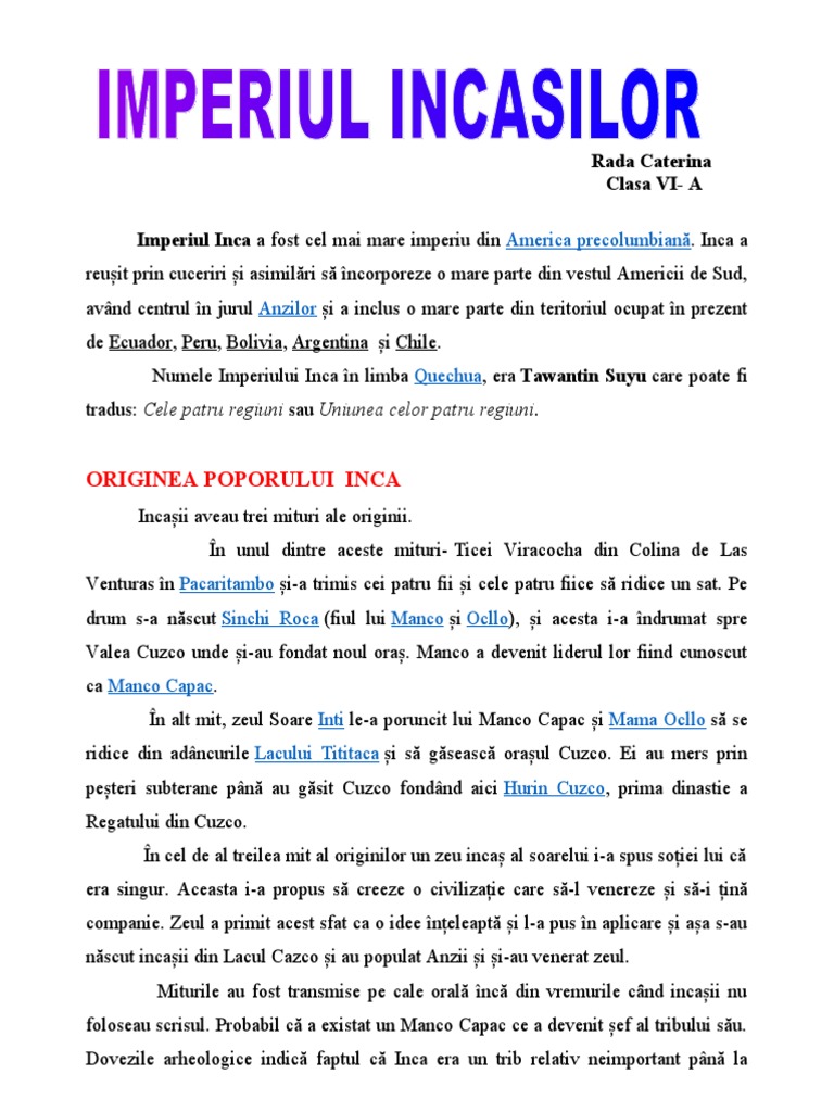 Imperiul Inca a fost cel mai mare imperiu din America precolumbiană. Inca a