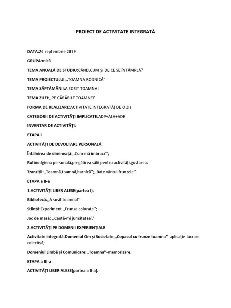 PROIECT DE ACTIVITATE INTEGRATĂ