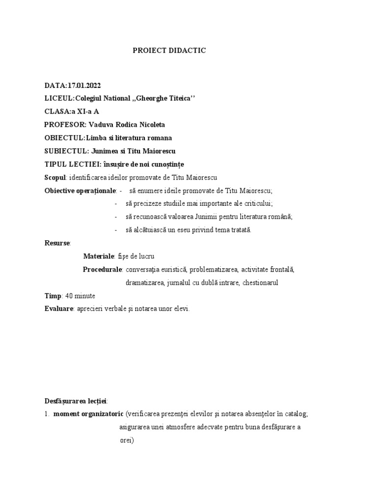 4. captarea atenţiei (se va citi un fragment din studiul lui Titu Maiorescu ,, O cerecetare critica