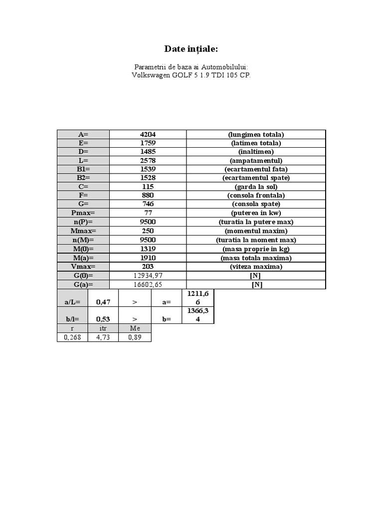 Parametrii constructivi ai automobilelor, utilizali de altfel şi la tractoare sunt următorii: