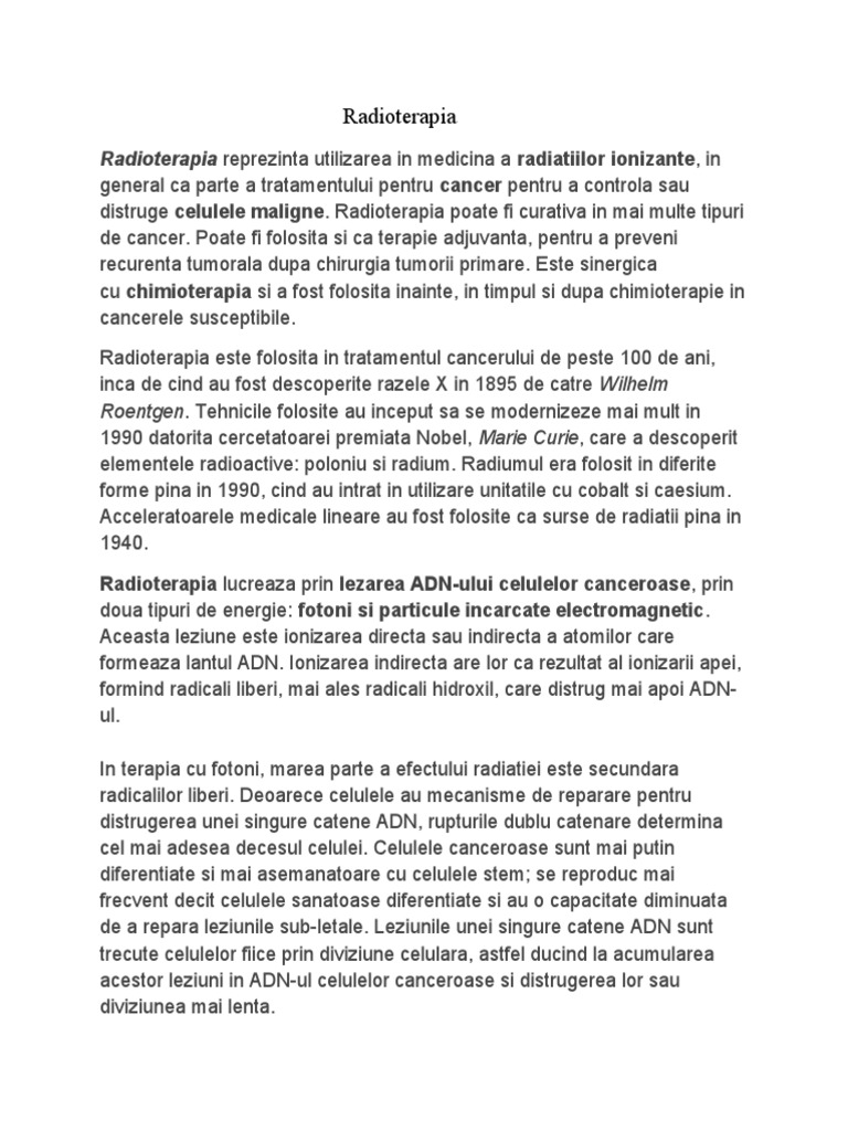 Radioterapia reprezinta utilizarea in medicina a radiatiilor ionizante, in
