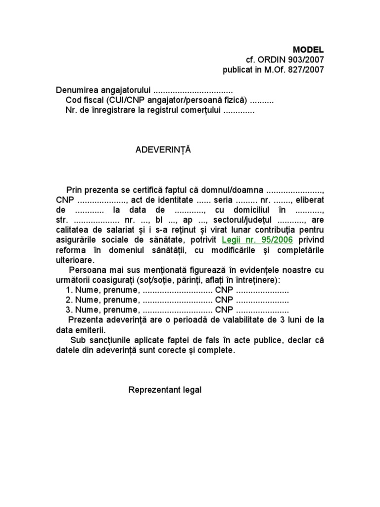 Prin prezenta se certific faptul c domnul/doamna ......................., CNP ...................., act de identitate ...... seria ......... nr. ......., eliberat de ............ la data de ............, cu domiciliul n ..........., str. ................... nr. ..., bl ..., ap ..., sectorul/judeul ..........., are calitatea de salariat i i s-a reinut i virat lunar contribuia pentru asigurrile sociale de sntate, potrivit Legii nr. 95/2006 privind reforma n domeniul sntii, cu modificrile i completrile ulterioare. Persoana mai sus menionat figureaz n evidenele noastre cu urmtorii coasigurai (so/soie, prini, aflai n ntreinere): 1. Nume, prenume, ............................. CNP ...................... 2. Nume, prenume, ............................. CNP ...................... 3. Nume, prenume, ............................. CNP ...................... Prezenta adeverin are o perioad de valabilitate de 3 luni de la data emiterii. Sub sanciunile aplicate faptei de fals n acte publice, declar c datele din adeverin sunt corecte i complete.