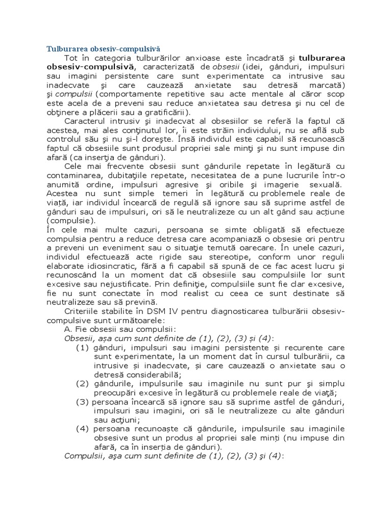Criteriile stabilite în DSM IV pentru diagnosticarea tulburării obsesiv-
