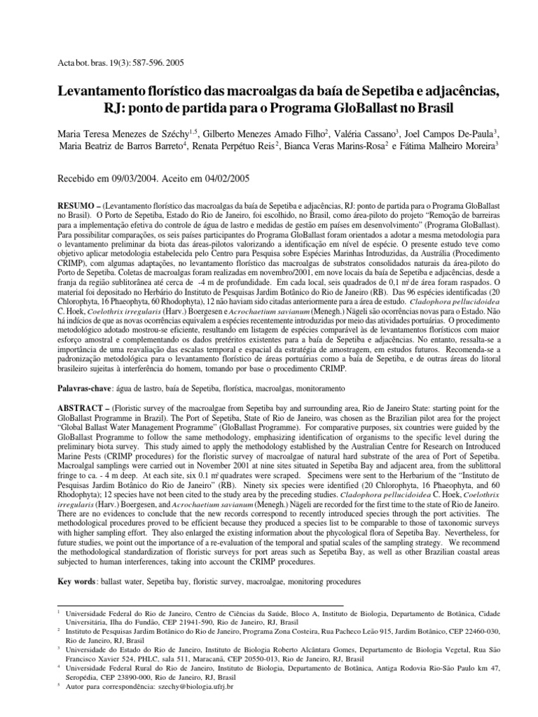 ABSTRACT – (Floristic survey of the macroalgae from Sepetiba bay and surrounding area, Rio de Janeiro State: starting point for the GloBallast Programme in Brazil). The Port of Sepetiba, State of Rio de Janeiro, was chosen as the Brazilian pilot area for the project “Global Ballast Water Management Programme” (GloBallast Programme). For comparative purposes, six countries were guided by the GloBallast Programme to follow the same methodology, emphasizing identification of organisms to the specific level during the preliminary biota survey. This study aimed to apply the methodology established by the Australian Centre for Research on Introduced Marine Pests (CRIMP procedures) for the floristic survey of macroalgae of natural hard substrate of the area of Port of Sepetiba. Macroalgal samplings were carried out in November 2001 at nine sites situated in Sepetiba Bay and adjacent area, from the sublittoral fringe to ca. - 4 m deep. At each site, six 0.1 m 2 quadrates were scraped. Specimens were sent to the Herbarium of the “Instituto de Pesquisas Jardim Botânico do Rio de Janeiro” (RB). Ninety six species were identified (20 Chlorophyta, 16 Phaeophyta, and 60 Rhodophyta); 12 species have not been cited to the study area by the preceding studies. Cladophora pellucidoidea C. Hoek, Coelothrix