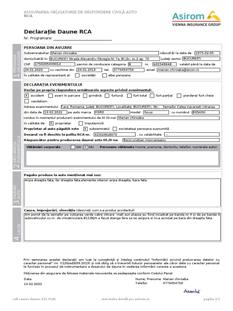 Declarație Daune RCA