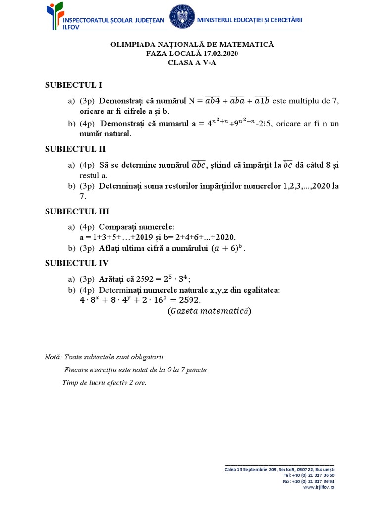 Olimpiada de matematică - Faza locală 17.02.2020