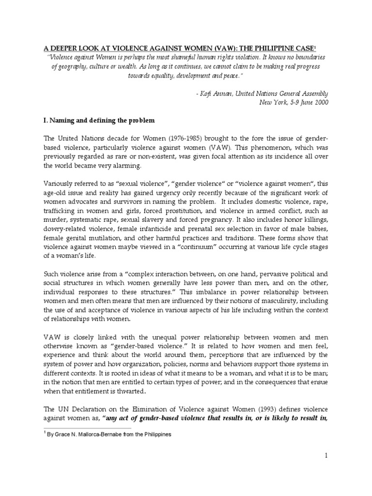 KofiAnnan,UnitedNationsGeneralAssembly NewYork,59June2000 I.Naminganddefiningtheproblem The United Nations decade for Women (19761985) brought to the fore the issue of gender based violence, particularly violence against women (VAW). This phenomenon, which was previouslyregardedasrareornonexistent,wasgiven focalattentionasitsincidenceallover theworldbecameveryalarming. Variouslyreferredtoassexualviolence,genderviolenceorviolenceagainstwomen,this ageoldissue and reality hasgained urgency only recently becauseof the significant work of women advocates and survivorsin naming the problem. Itincludes domestic violence, rape, trafficking in women and girls, forced prostitution, and violence in armed conflict, such as murder, systematicrape,sexualslavery andforcedpregnancy.Italsoincludeshonorkillings, dowryrelated violence, female infanticide and prenatal sex selection in favor of male babies, female genital mutilation, and other harmful practices and traditions. These forms show that violenceagainstwomenmaybeviewedinacontinuumoccurringatvariouslifecyclestages ofawomanslife. Suchviolencearisefromacomplexinteractionbetween,ononehand,pervasivepoliticaland social structures in which women generally have less power than men, and on the other, individual responses to these structures. This imbalance in power relationship between womenandmenoftenmeansthatmenareinfluencedbytheirnotionsofmasculinity,including theuseofandacceptanceofviolenceinvariousaspectsofhislifeincludingwithinthecontext ofrelationshipswithwomen. VAW is closely linked with the unequal power relationship between women and men otherwise known as genderbased violence. It is related to how women and men feel, experience and think about the world around them, perceptions that are influenced by the systemofpowerandhoworganization,policies,normsandbehaviorssupportthosesystemsin differentcontexts. Itisrootedinideasofwhatitmeanstobeawoman,andwhatitistobeman; inthenotionthatmenareentitledtocertaintypesofpower;andintheconsequencesthatensue whenthatentitlementisthwarted. The UN Declaration on the Elimination of Violence against Women (1993) defines violence against women as, anyact of genderbased violence that results in, or is likely to result in,